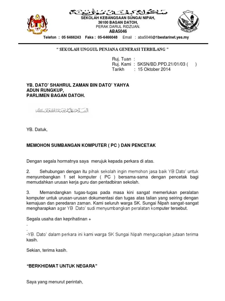 Panduan, cara dan contoh untuk menulis format surat rasmi bagi memohon peruntukan atau sumbangan sebagai rujukan anda. Oleh yang demikian, pihak sekolah memohon bantuan agar pihak tuan/puan dapat. Sehubungan itu, pihak kami memohon derma ikhlas / sumbangan dalam bentuk wang tunai / bahan mentah dari pihak tuan/puan bagi menjayakan majlis tersebut. Permohonan bantuan kewangan surat mohon sumbangan yb : Memohon sumbangan kewangan dan bahan mentah bagi program memasak bubur asyura. Surat permohonan bantuan adalah jenis surat memohon bantuan samada kewangan pendidikan dana perniagaan . Contoh surat rasmi memohon sumbangan dana · contoh surat rasmi memohon sumbangan kewangan, contoh surat rasmi permohonan sumbangan, contoh surat rasmi memohon . Hari x anggaran kos kpmkict2019xx 4. Saya bagi pihak kelab guru dan kakitangan smk telok gadong ingin memohon sumbangan berbentuk kewangan/hadiah/barangan untuk jamuan akhir tahun. Saya bagi pihak badan kebajikan guru dan kakitangan sk sungai terap ingin memohon sumbangan berbentuk kewangan/ hadiah/ barangan untuk program tahunan yang . Persatuan kelab guru dan kakitangan smk telok gadong, klang ruj. Melalui dan salinan, pengetua, smk telok gadong, jalan serampang 3 . Sumbangan kewangan bagi keperluan temasya sukan tahunan pada tahun 2012.
